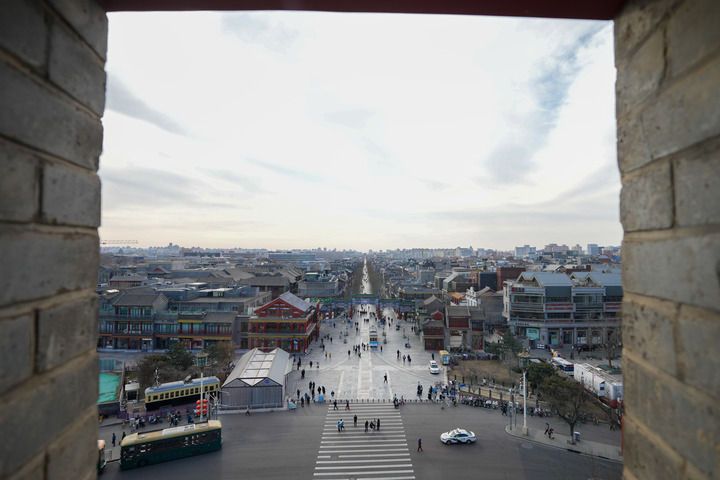 2024年12月26日,從正陽門箭樓內向南拍攝的北京前門大街和遠處的永定門城樓。新華社記者 鞠煥宗 攝