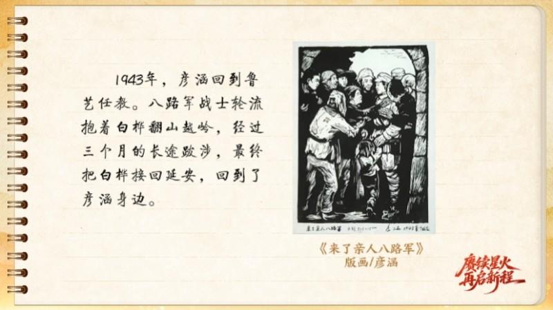 多年后,彥涵始終忘不了前線的戰斗生活,也忘不了老鄉高煥蓮對兒子四年的養育之恩。他便將兒子白樺的名字改名為“四年”,也將這段難忘經歷和這份深厚情感,凝刻在這幅《找媽媽去》的木刻作品中。
