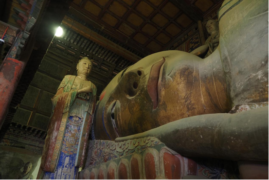 張掖的壁畫瑰寶,集中藏于石窟寺與古建筑之中,張掖大佛寺便是其中的璀璨明珠。這座始建于西夏崇宗永安元年(1098年)的寺院,擁有全國最大的西夏佛教殿堂臥佛殿,同時保存著530余平方米的珍貴壁畫。大殿正中,34.5米長的釋迦牟尼涅槃泥塑臥佛靜靜“安睡”,其木頭骨架、草泥貼塑的獨特構造,見證著古代工匠的智慧。