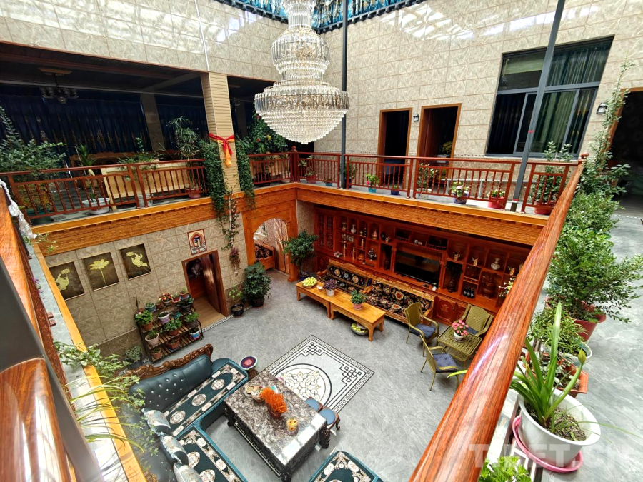 這處兩層藏式民居,二層是家人整潔舒適的臥室,點綴著個性化的生活照片;一層是寬敞的客廳與廚房等,各類花卉綠植為室內增添了生機與溫馨。整個居所干凈明亮,與傳統印象中的農居大不相同。