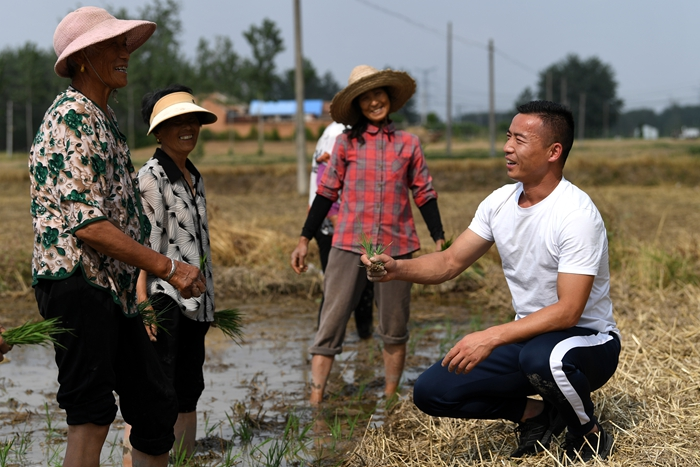 “三夏”時節戴虎在田間與村民們交流。受訪者供圖