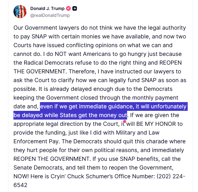 △當地時間10月31日,美國總統特朗普就“補充營養援助計劃”發表聲明。特朗普再次指責是民主黨導致政府“停擺”,最終招致美國民眾忍饑挨餓。