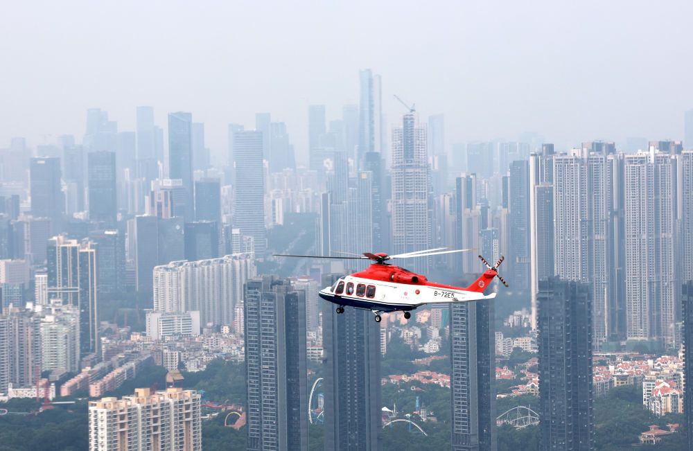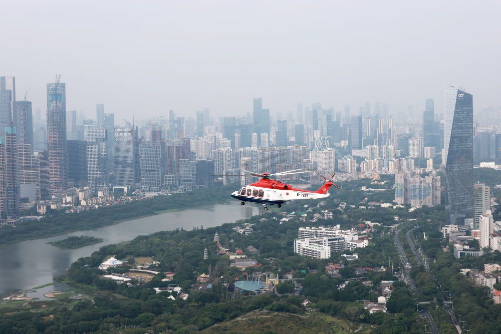 ↑ 搭載圣火的直升機進行空中傳遞。新華社記者 梁旭 攝