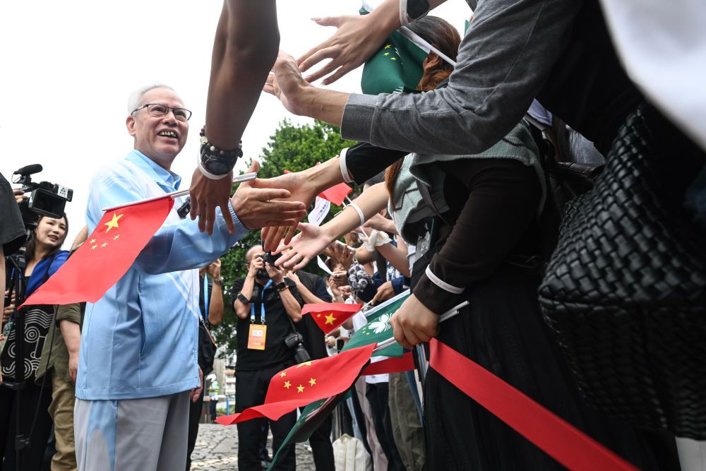 ↑ 澳門特區行政長官岑浩輝(左)在火炬傳遞活動中和觀眾握手。新華社記者 那宇奇 攝