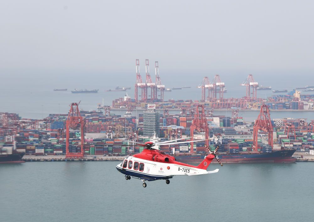 ↑ 直升機搭載圣火進行空中傳遞。新華社記者 梁旭 攝