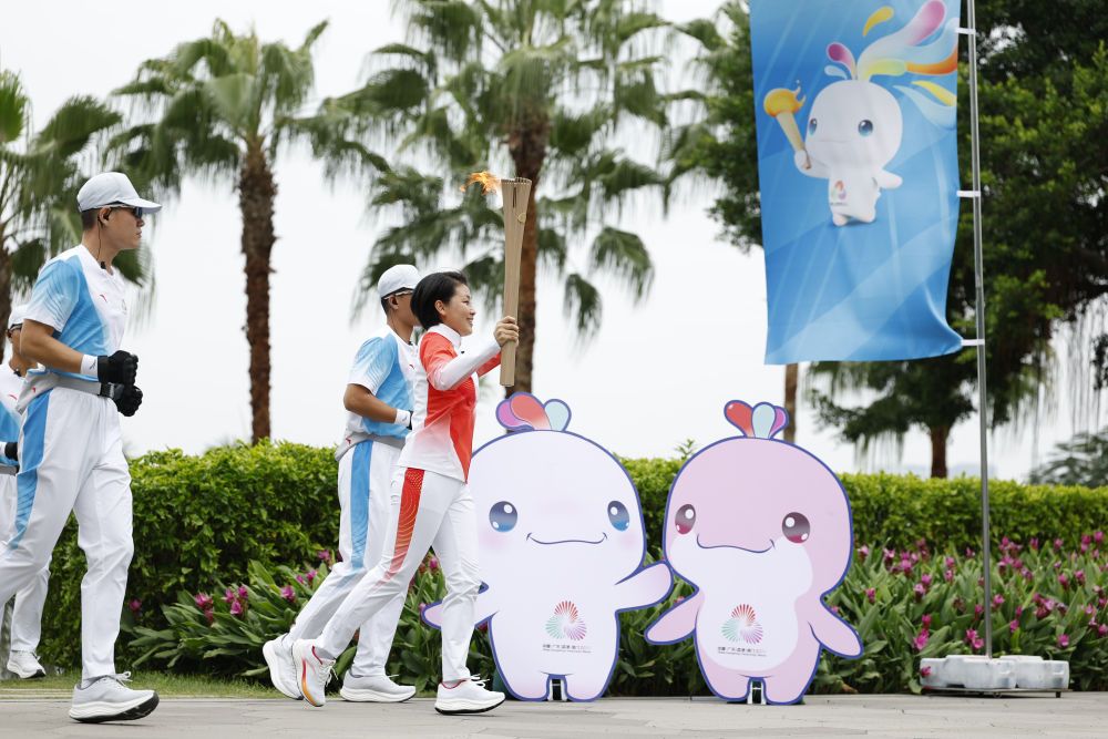↑ 火炬手關恩賜(右一)與十五運會和殘特奧會志愿者團隊火炬手在傳遞活動中。新華社記者 黃偉 攝