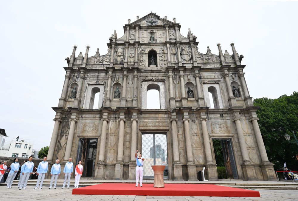 ↑ 火炬手羅協銘在大三巴牌坊前進行火炬傳遞。新華社發(張金加攝)