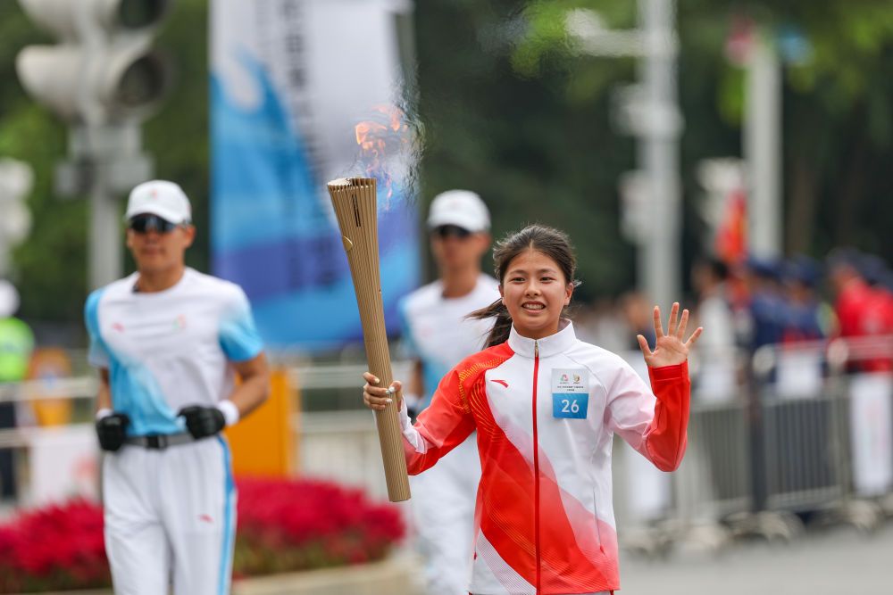↑ 火炬手葉欣怡在火炬傳遞活動中。新華社記者 黃偉 攝
