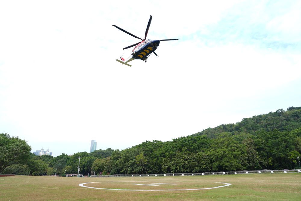 ↑ 搭載圣火的直升機進行空中傳遞。新華社記者 江漢 攝