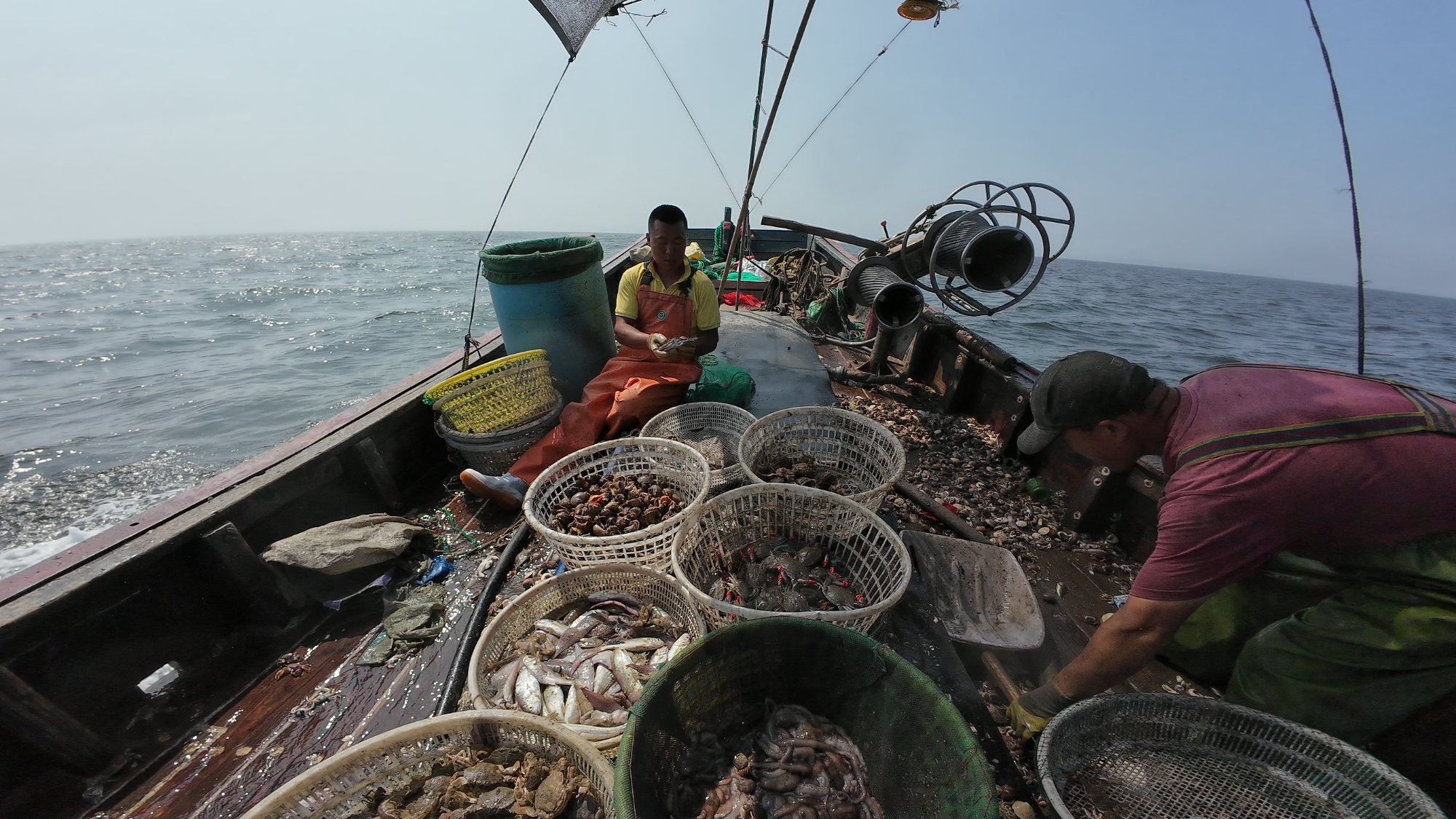 日益恢復的生態,讓漁民們的收獲也多了起來?!拔乙荒昴懿稉扑笞有啡那Ы?,海螺一萬多斤,八爪魚也能捕個兩三千斤,再加上其他海貨,收入還是挺滿意的?!睗O民于生利說。
