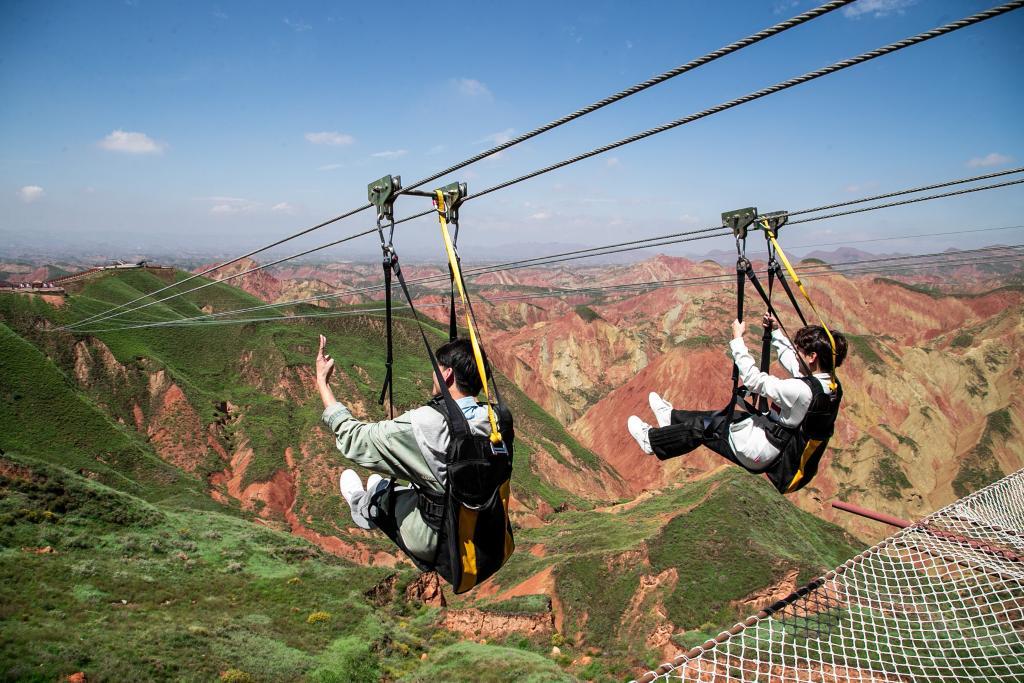 游客在蘭州水墨丹霞旅游景區體驗玻璃漂流項目。新華社記者 郎兵兵 攝
