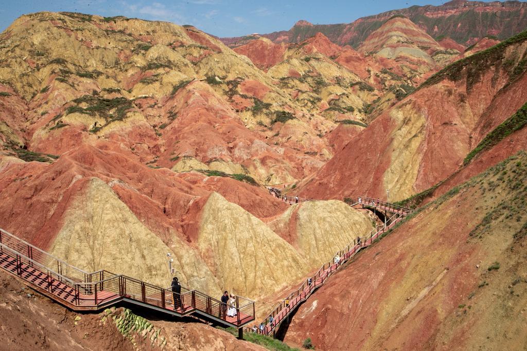 漫步景區,放眼望去,紅色與青灰色交錯分布,恍若置身于一幅水墨丹青中。移步登高,起伏的“彩丘海浪”直通天際?!叭嗽诋嬛杏?,我從景中來?!边@是不少游客的感受。