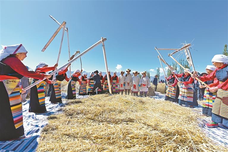圖為深秋時節,在拉薩市林周縣強嘎鄉典沖村,當地農民用傳統方式打場(資料圖片)。記者 王敏 攝