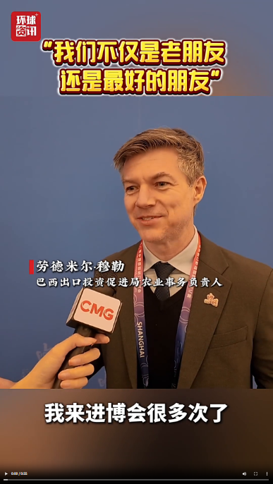 巴西出口投資促進局農業事務負責人勞德米爾·穆勒接受總臺環球資訊廣播記者采訪時表示,巴西每年都積極參與進博會,不僅是進博會的老朋友,更是最好的朋友。