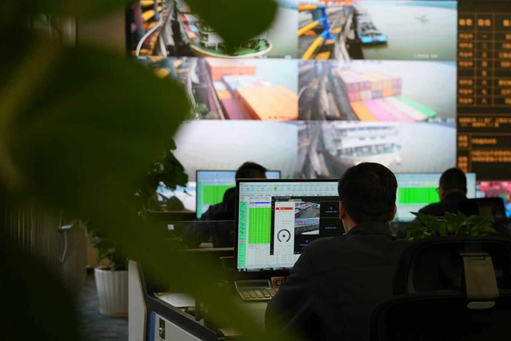 工作人員在重慶果園港遠控室操作吊裝集裝箱。新華社記者 李愛斌 攝