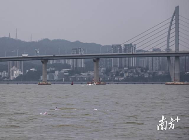 11月6日傍晚,十五運會自行車公路賽開賽在即,港珠澳大橋公路口岸附近海域突然迎來一批特殊的“加油團”,數頭被譽為“海上大熊貓”的中華白海豚嬉戲游弋。