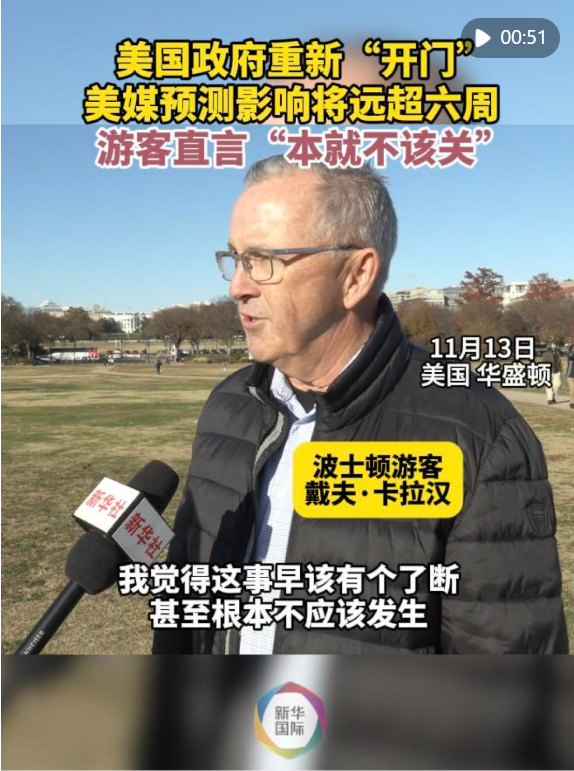 11月13日是持續43天的美國政府“停擺”結束后的第一天。新華社記者在首都華盛頓特區看到,華盛頓紀念碑暫未開放,但周邊游客絡繹不絕。當被問及對政府重新“開門”的感受時,有人直言“太好了”,有人表示“總算松了一口氣”,也有人抱怨“本來就不該關門!”