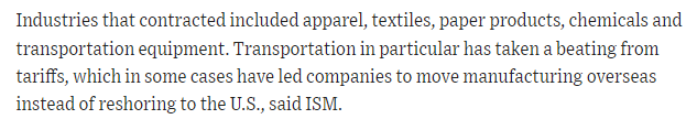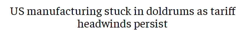 文章指出,美國制造業活動萎縮的行業主要包括服裝、紡織品、紙制品、化工產品和運輸業。文章表示,雖然當前美國工廠產量有所增加,但未售出的庫存卻急劇增加。需求增長放緩,這在出口市場體現尤為明顯,而受關稅影響,出口市場的前景更加暗淡。