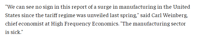 文章指出,美國政府曾辯稱,加征關稅是保護美國國內制造業的必要之舉,但經濟學家則認為,由于包括勞動力短缺在內的結構性問題,美國制造業已無法恢復昔日輝煌。文章援引高頻經濟咨詢公司首席經濟學家卡爾·溫伯格(Carl Weinberg)的話表示,“從(ISM)這份報告中,我沒有看到自關稅政策出臺以來,美國制造業出現任何增長的跡象,美國制造業已經病了?!?/p>