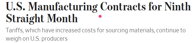 《華爾街日報》1日發表文章稱,美國供應管理協會(ISM)當天公布的調查報告顯示,11月美國制造業采購經理人指數(PMI)已低于50的榮枯分界線。美國制造業活動連續第九個月萎縮,而美國制造商認為這主要是因為美國政府的關稅政策。