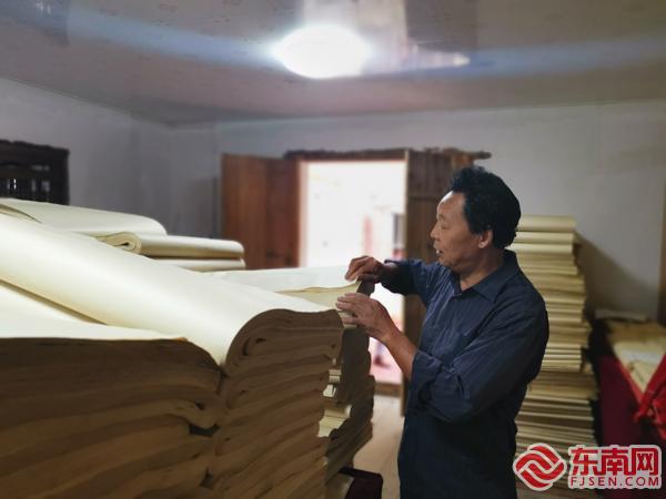 劉仰根整理今年造的新紙。 肖曉敏 攝 西山造紙技術完整傳承了蔡倫造紙工藝,造出的紙紙質經久不蛀、久存不變色,是書寫、印刷、修復古籍的佳品。 西山竹紙取材于國家級自然保護區龍棲山的上等嫩毛竹,從備料到生產要等120多天,造出一張合格的紙需經過備灰、劈山、修料塘、浸漂、壓塘等二十八道工序,對造紙藝人的技術和耐心提出了很高的要求。抄紙是其中最考驗手藝人技術的環節,手藝人要做到心手相連,雙手將紙簾放入漿液中,慢慢抄起漿液,前后左右蕩,利用手腕的力量過濾掉多余的雜質,將精華留住,反扣在紙架上,一張紙就好了。 2008年獲得“國家級非遺”的招牌后,傳承人劉仰根堅持不懈,每年花幾萬元補貼竹紙作坊生產并教導學徒。漸漸地,劉仰根制作的西山竹紙受到社會各界和市場的關注和認可。2010年起,通過連續幾年參加海峽兩岸文博會,西山竹紙逐步拓展了銷售市場,許多書畫家、出版社紛紛前來龍棲山訂購西山竹紙。隨著政府和社會對文化傳承工作的重視,西山竹紙進校園、進社區、進直播間......獲得了更多人的熱愛。 |