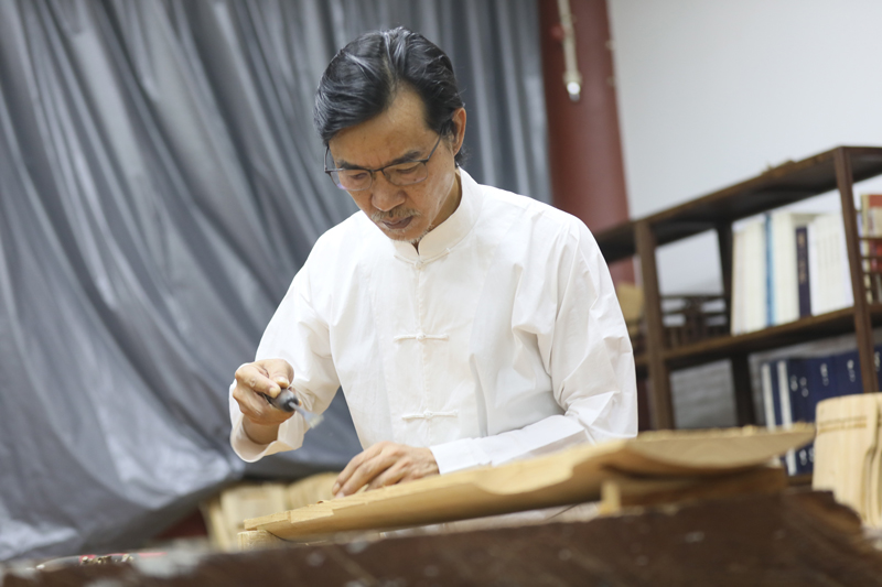 魚腹狀的槽腹結構,是形成古琴悠長聲韻的物理條件。斫琴師需要根據每塊木頭的紋理結構、木質通透程度等要素,設計相應的槽腹結構。王文強 攝 “絲桐合為琴,中有太古聲?!边x材、定型、槽腹、灰胎、打磨、定徽、面漆、上弦……千年古法斫琴工藝,前后有上百道工序,一床琴至少需要七年打造。 造琴過程中,最能展現斫琴師技藝的,是挖槽腹。魚腹狀的槽腹結構,是形成古琴悠長聲韻的物理條件。斫琴師需要根據每塊木頭的紋理結構、木質通透程度等要素,設計相應的槽腹結構。槽腹的深淺,中空的大小,底面厚薄的比例……所有微妙的細節,全憑一雙手把握。琴聲空靈和空洞的距離,可能只有一毫米,每次下刀,都考驗著斫琴師的經驗、手感與心性。 2010年,省級非遺項目古琴傳統制作技藝代表性傳承人謝建東,在長泰縣天柱山腳下創建了中國龍人古琴文化村,為古琴安了“家”。2017年,古琴制作技藝被列入福建省第五批省級非物質文化遺產代表性項目名錄。如今,龍人古琴文化村已先后被列為省級和國家級重點文化產業園區,成為文旅部國家文化產業示范基地和省級非遺項目古琴傳統制作技藝保護單位。 |