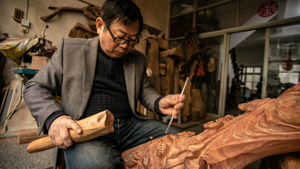 一塊實木板上放著鑿、雕刀、鋸、鉆等工具,匠人沉浸于雕刻中,選材、設計、打胚、修光……