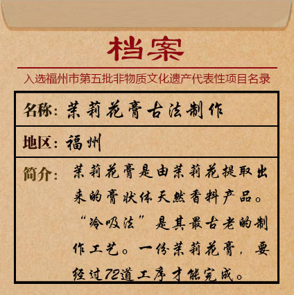 茉莉花膏古法制作中 郭斌說道,古法制作技藝由三部分組成:茉莉植物種植、再到天然原料窨造,以及花膏成分藝術,三者缺一不可。在尋訪技藝的過程中,郭斌決心重拾最傳統復雜的古法——冷吸窨制技藝。郭斌介紹道:“早在青銅器時代我們的老祖宗就已經領悟了這項工藝的基本原理——油脂吸香。但是古法也需要創新。傳統的福州茉莉花膏都是以豬油、鵝油這樣的動物性油脂為基底,這個已經過時了,芳療行業都已經普及了植物性基底油?!币磺械扔谥匦麻_始,郭斌只能自己鉆研摸索植物基底油的茉莉花膏制作。 沒有現成的資料可以參考,他只能向親戚、朋友、業界前輩請教,遵循生態天然原則,經過多年研究琢磨,目前郭斌已經將植物凝脂與茉莉花香盡可能地完美融合。 制作花膏得從頂尖的原材料開始,福州本土茉莉含酮高,其中的單瓣茉莉是首選。郭斌堅持取材的高標準,他在福州城門鎮樟嵐山的“古茉園”和花農合作,建設有品質的花田。 同時在采摘的過程中,采用純手工采摘,遵循“花采伺、半開者、密封之、日一易”。
