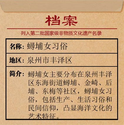 走進泉州市豐澤區蟳埔村,被粗網包裹的青灰色蠔殼隨處可見,幾座蠔殼厝藏于民居中,整個村莊顯露出濃厚的“海味”。在這座海邊漁村里最為亮眼的莫過于來來往往著裝特別的蟳埔女——粗布斜襟右衽衣簡樸寬松,搭配七分黑褲,頭發綰成髻,戴著鮮艷美麗的簪花圍,行走間便成了一道風景線。