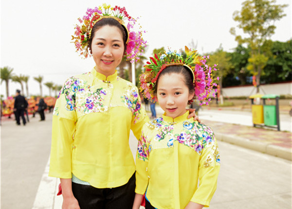 隨著時間流逝,穿著蟳埔女傳統服飾的年輕人越來越少,但不少老人還是有意識地為孩子穿上傳統服飾,希望傳承這一文化。東南網記者 林婕 攝 正因蟳埔女服飾承載的意義重大,這份文化符號背后的傳承就顯得彌足珍貴。黃晨感慨道,以前的蟳埔女,自出生后家中便開始準備傳統服飾,從小穿到大。如今在村中,穿著蟳埔女傳統服飾,盤頭戴簪花圍的多為中老年女性,年輕一代穿著傳統服飾的人數十分少,“很多人連穿都很少穿,更別提能制作這些傳統服飾了?!?/p> 近年來,蟳埔女習俗在多方宣傳下得到了越來越多的關注,蟳埔女這一獨具特色的形象也吸引了不少人的注意,在多個民俗文化節上均能看到身著蟳埔女傳統服飾的年輕女孩致力宣傳這一形象及背后的民俗文化。但熱鬧之余,愿意真正學習蟳埔女服飾制作的人依然是少之又少,“曾經有人來找我學過這項技藝,但是學過一段時間后還是選擇放棄了?!闭劶按耸?,黃晨露出無奈的笑容,“現在讓大家長時期待在一個房間里縫縫剪剪,很多人可能都做不到?!?/p> 走進高校 傳統技藝喚醒傳承希望