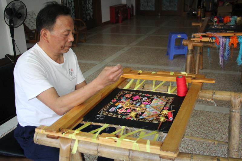 陳鐘輝不時地自己繡上幾針。東南網記者 林永清 攝