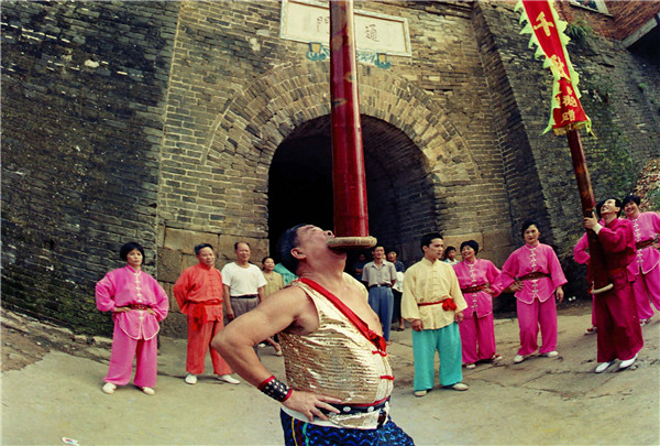 老方的一指禪。 魏劍生 攝 方振南是陳泉成的弟子之一,不僅手藝了得,更是建甌少兒挑幡的“領頭羊”。大家都親切地稱他為“老方”。正是他十年來的堅持和努力,讓挑幡得以一代代傳承下去。 從1961年開始學雜技,1986年開始學挑幡,老方說起挑幡頭頭是道?!斑@東西一點都不神秘,就是靠練。一要體力好,二要站得穩,三要會用巧勁。我總結了7個字:眼帥,手將,腳是兵?!眲e看老方說得輕巧,真要練到隨時都能表演的功夫,最快的也要一兩年。 “用蠻力是不行的,你和20公斤重的東西較什么勁?!崩戏竭种熘钢约郝╋L的牙說,當初,他的牙就是在一次表演時被打裂的?!爱敃r安排前排的人往后拋幡,后面的人接住,但我前面那兄弟可能緊張了,力道太大,我一接,整根幡朝我臉倒下來,牙都被砸裂了?!?/p> 但老方也說,只要有人指導,別做難度太大的動作,挑幡還是安全又能強身健體的。 老方帶我們到他平時存放器材的小倉庫,打開鐵門,一路佝僂著腰的老方忽然精神起來。只見他端出了一根10米多長,近20公斤重的幡,頂端有一座裝飾用的竹骨和彩綢制成的六角寶塔?!笆职W了,給你舞兩下?”老方邊說邊耍了起來。這根許多人拿都拿不直的幡,似有靈性一般,輾轉騰挪間,穩穩地“站”在肩膀、牙齒、腳面、大拇指甚至鼻子上。 今年69歲的老方是建甌市建州技藝團的老團長。老方的隊伍目前有30多名隊員,還教著40多個孩子。平常團里隊員都有各自的事業,比如老方就開了家中藥材店,其他隊員種菜、做小買賣等等?!吧鐖F沒什么收入,接表演的收入也要用來維護器材,挑幡只能純屬業余愛好?!崩戏接行o奈地說。