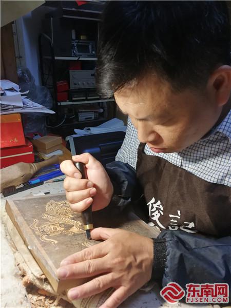 顏仕國展示傳統木版《魁星點斗》。東南網記者 陳志遠 攝 53歲的顏仕國是漳州顏氏木版年畫的第六代傳人,專擅印刷。據他介紹,目前他家位于漳州古城的老房子里收藏著兩千多個文字字版,上百個年畫雕版,數量屬國內之最。顏仕國說,顏氏印制人物、動物等年畫,采用五色或六色套印,先印淺色的白、紅、黃、綠,最后印黑色;絕活是功德紙,就是用黑色紙印制民俗活動所需的各種圖案,是全國木版年畫僅有的一個品種。 顏仕國從11歲開始學習印刷,自小在木版、染料與紅紙間穿梭,逐漸習得印刷技藝。2006年,顏仕國帶著近百幅年畫趕赴西安參加全國木版年畫展,漳州木版年畫大放異彩,一舉獲得國內專家的高度贊譽。 2008年顏仕國與父親顏文華被共同列為第二批省級非遺代表性傳承人。2009年,80歲的顏文華病逝,2018年,顏仕國成為漳州木版年畫唯一的國家級非遺代表性傳承人。 “首先要對傳統文化習俗有敬畏之心”,顏仕國這樣說到。出生于木版年畫世家的他,身上洋溢著深厚的梨木氣息。在他家里到處掛著木版年畫,內容大多圍繞風俗節令、宗教祭祀等題材,體現了勞動人民對傳統習俗的敬畏和對美好生活的向往。 顏仕國擅長印刷,調色時所需的各種顏色配料的配比數據,現在顏氏家族中只有他較為熟稔。過去漳州木板年畫的印制過程只在自家屋子里,謝絕外人觀看,而如今,在木版年畫的保護傳承方面,比起“金屋藏嬌”,顏仕國認為應該打破這層傳統桎梏,積極對外開放,讓更多人來了解這項技藝。 顏朝?。簭涂探浀?對接文創 顏朝俊的爺爺顏玉成與顏仕國的父親顏文華是親兄弟,在過去,顏文華負責年畫套色印刷,顏玉成負責雕版,分工明確,因而顏朝俊自小模仿著家中長輩,摸索雕版技巧。