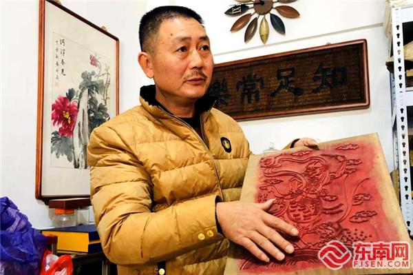 顏仕國家中擺放的傳統木版。東南網實習生 黃梓娟 攝 據介紹,清道光年間,顏氏家族29世顏廷貫和顏神福兩兄弟,分別在潮汕、大田為官,后來辭官定居漳州,合開了刻字鋪。他們發現,漳州是閩南各地學子會考之地,每到科考時,赴考學子總是四處尋找會考必讀書籍,于是開辦了“顏錦華”作坊,分設黑、紅兩房?!昂诜俊笨趟臅褰浀瓤寂e必備的書,供學子在漳州科舉考試和赴省城應試所用;“紅房”則經營民間木版套色年畫,專供民間過年過節及操辦婚嫁喜慶的需要。除了年畫以外,也制作冥事活動所用的物料。 漳州木版年畫的品種很多,從形式上看,有不同類別的各種門畫、門頂畫、中堂畫,有欣賞用的獨幅畫、連環畫等。木版年畫的雕版分陽版和陰版兩種,像門畫“幼神”直接以人物背景色印制的版為陰版,印制時采用版套印,先色版,后墨線版;而“粗神”指的是以大紅或朱紅紙為底加以印制的門畫。風格上,漳州木版年畫既有北方年畫的粗獷豪放,又有南方年畫的靈巧纖美,具有濃郁的閩南傳統文化特色。主要流傳于閩南、嶺南一帶,并遠銷臺灣、香港和東南亞等地。 抗日戰爭時期,漳州許多木版年畫作坊接連倒閉,顏氏家族利用這個機會,將各家的木版年畫木雕底板收購下來,集于一家。其中,一部分明代雕版尤為珍貴,被專家譽為“中國民間年畫雕版的稀世珍品”??箲饎倮?,顏家的木版年畫已經壟斷了漳州的市場。 但二十世紀五十年代以來,漳州地區張貼年畫的習俗漸漸消失。到了六七十年代,漳州木版年畫產業遭到了重創,年畫作坊大多停業,老木版在歷史浪潮中流失,漳州木版年畫市場漸漸走入低谷。 改革開放以來,在各方的重視下,漳州木版年畫這一民間文化瑰寶重放異彩。1986年顏家印制了一套古木版年畫,在全國民間美術工作大會上得到與會專家們高度贊賞;1990年,漳州木版年畫載入《中國民間藝術大辭典》;2006年5月,漳州木版年畫入第一批國家級非物質文化遺產名錄。2009年中國郵政發行了全套4枚的《漳州木版年畫》系列郵票,中華書局、福建人民美術出版社、漳州圖書館等先后出版了漳州木版年畫書籍。 顏仕國:守護歷史 敬畏傳統