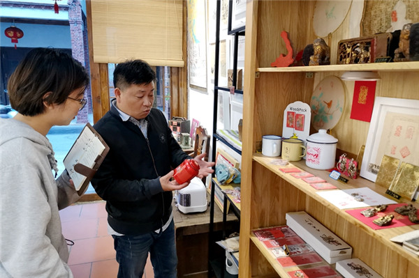 顏朝俊將年畫元素融合到搪瓷杯、書簽、冰箱貼等日常用品中。 東南網記者 陳志遠 攝 挖掘修復老木版的同時,這幾年,顏朝俊也致力于讓傳統年畫對接文化創意產業,為此他辭去穩定的工作,專心投入其中。他不斷創新年畫題材,將漳州現今的地方特色融入到年畫中去;并創新手法,在一些作品中使用棉簽點繪,制造畫面的立體光影;創新載體,將年畫元素融合到搪瓷杯、T恤、書簽、冰箱貼等等,“最好的創新就是將年畫融入到日常生活可看可用的這些東西里?!边@是顏朝俊的創新理念。 創新與傳承 一門技藝長久繁榮不可或缺的關鍵有二,一是傳承,二是創新。對此顏氏家族的后人們正各盡所能地做出努力。 過去,漳州顏氏木版年畫技藝有著“傳內不傳外”的規定,然而,面對木版年畫手藝人所剩無幾的窘迫,顏仕國不得不打破這一傳統,轉變觀念,開始向外尋找合適的傳承人。一方面通過“非遺進校園”活動,他將木版年畫帶到孩子們面前,在體驗印刷的同時,普及木版年畫的知識內涵;另一方面著手傳承人的培養,“希望他是性格堅韌的人,能夠發自內心地熱愛這項手藝”,這是顏仕國對傳承人的期待。 顏仕國對木版年畫的創新發展也抱著包容的態度。他說,機刻與傳統套色印刷工藝相結合,能更好地提高生產效率,這是好事。當前顏仕國還有自己的本職工作,他表示等退休后,將全力投入到漳州木板年畫的傳承工作中。同時,顏仕國與其他木版年畫傳承人時常交流,共同探討出路。