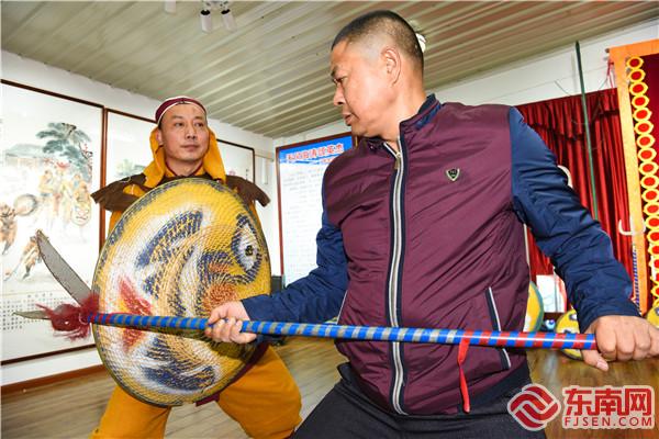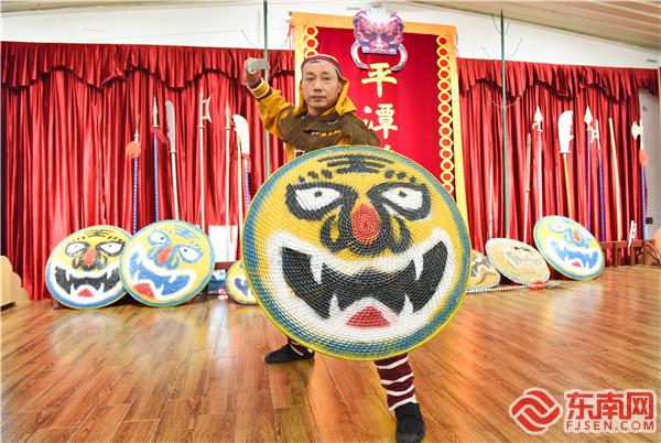 陳文英正在練習藤牌操 東南網記者 張哲昊 攝 走進平潭藤牌操傳承基地三樓陳列室,記者一下就被墻邊整齊擺放著的長槍、短刀、鹿角叉等兵器,以及造型各異的虎頭藤牌所吸引。 要靈活運用這些兵器與藤牌陣法并非易事。陳文英告訴記者,藤牌操訓練強度之大,讓不少學員望而卻步?!拔疫@一批師兄弟,大部分人就是倒在了‘鴛鴦步’這招上?!彼f,許多人扛不住,新鮮勁兒一過就紛紛退出了。 陳文英口中的“鴛鴦步”,正是藤牌操的精髓所在。這種步法以腿上功夫見長,要求練習者蹲下身子,降低身體重心,雙手擺好架勢,兩腿交叉快速前進,對體能要求極高。 現場,陳文英為記者演示了一遍“鴛鴦步”,只見他不僅步伐扎實穩健,還能一邊舉起武器與藤牌比劃,一邊與旁人交流,大氣不喘一口?!叭裟軌蛴么苏行袆幼匀?,才能進而學習陣法?!彼f。 這并非一朝一夕之功。為了練好藤牌操,陳文英白天在外務工,晚上才一頭扎進由石板條搭建的簡易訓練場練操,時常一練就是一整夜,直到將“蹲跳滾爬”四項基礎功夫完全掌握,方才出師,這花了他3年多的時間。 在他看來,學藤牌操門檻不算高,最要緊的是需勤練不輟。之后,陳文英逐漸成長為藤牌操傳人中的中流砥柱,常利用空閑時間義授藤牌操,在當地已積累了一定名氣,一年到頭要承接十數場演出。 可事與愿違,平潭藤牌操由盛再度轉衰,幾乎就是轉眼的事。 上世紀90年代末以來,藤牌操的觀眾逐年減少,老師傅相繼離世,其它藤牌手大多涌向外地謀生,而年輕一代卻不愿意接班。 更令人擔憂的是,藤牌操保留下的正宗套路僅余三分之一!若不加以保護,很有可能會上演“人亡藝絕”的悲劇,這讓陳文英的心里火急火燎。 “藤牌操是老祖宗留下的遺產,一定要守護好!”陳文英謹記師父的囑托,迫不及待地行動起來,開始了傳承藤牌操的“保衛戰”。 傳承:破除舊規,煥發新活力