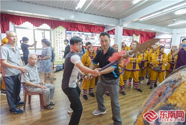 陳文英(左)與師兄張緯榮練習藤牌操 東南網記者 張哲昊 攝 今年55歲的陳文英正是陳錦和的曾孫,他說,自己家中世代傳承藤牌操,祖父陳阿命過去常在家中教導伯父陳輝生練習藤牌操,二人都是當地響當當的藤牌操手,他耳濡目染,對藤牌操產生了濃厚興趣。 可惜的是,“文革”期間,藤牌操所用兵器均被收繳,這項流傳了數百年的民間藝術逐漸消匿于田間地頭,傳承一度式微。直到上世紀80年代初,第三、四代傳人們一口氣招收了26名弟子,才慢慢恢復元氣,又重出“江湖”,重獲生機。 陳文英就是這批弟子其中之一。18歲起,他便師從伯父陳輝生,成為了平潭藤牌操第五代傳人。 陳文英回憶,每逢宗族祭祀、佳節慶典等場合,藤牌操一定是必備表演項目,圍觀群眾眾多,可以說是“萬人空巷”。 在表演過程中,藤牌操手身著仿古武士裝,右手持兵器,左手拿虎頭藤牌,與“對手”“短兵相接”,隨著音樂輾轉騰挪,一時間刀光劍影,觀賞性極佳?!吧磉呍S多朋友看完后,也會在閑暇時模仿起來,慕名前去拜師學藝的年輕人更是絡繹不絕?!标愇挠⒒貞浾f。 尚武之風再度興起。在這樣的氛圍下,陳文英開始了學藝之路,這一堅持,就是大半輩子。 學藝:苦練絕活,走上傳承路
