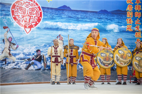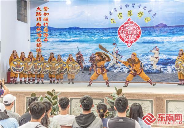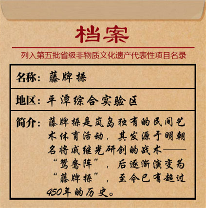 藤牌操表演 江信恒 攝 平潭藤牌操又稱“藤牌舞”,發源于明嘉靖年間,由抗倭名將戚繼光所創的戰陣戰術“鴛鴦陣”演變而來,即讓兵勇手執藤制盾牌,配長短兵器,在陣法之中跳躍滾動,前進殺敵。 據史載,明清以來,平潭一直是海防重地。戚家軍入駐平潭后,發動當地兵勇操練“鴛鴦陣”,抵御倭寇,該陣式因此在平潭日益普及,經過歷代改良,慢慢演變為“藤牌操”。 民國初年,平潭因積貧積弱導致疾病盛行,民眾遂將藤牌操視作健身活動,大練藤牌操,以驅邪降癘,強身健體。藤牌操迎來了“黃金時代”,一度風靡嵐島。 后來,當地著名武師陳錦和將藤牌操與技擊、體操、舞蹈等相融合,形成了一字長蛇、二龍戲珠、三才定穴等十個陣法,以及太公獨釣、仙人指路、觀音坐蓮等三十六套招式,這才確立了沿襲至今的表演“范式”。藤牌操也逐漸成為民間文娛活動中的“藤牌舞”。