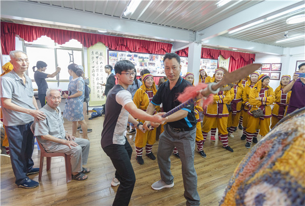 陳文英正在指導臺灣青年練習藤牌操。 江信恒 攝 由于藤牌操的武術特性,其傳人一度以男性為主,他們大多是家中頂梁柱。一直以來,藤牌操演出都是以“純義務、零收費”的模式進行,難以糊口,如何生存?這成了限制藤牌操發展的桎梏。 轉機出現在2012年初,央視《新春中國行》節目組來到平潭,全程直播了藤牌操表演,向海內外觀眾展示這一民俗瑰寶,藤牌操一時名聲大噪。 此后,商演的機會如雨后春筍般涌現,藤牌操手也有了收入保證。同時,當地政府的重視程度與扶持力度不斷加大,通過將藤牌操與海島旅游、兩岸文化交流相結合,衍生出了許多活動,收獲了來自海峽兩岸民眾的青睞?!把莩鰣龃闻c昔年相比,翻了一番?!标愇挠⒄f。 2012年底,平潭藤牌操協會應運而生,陳文英任副會長、教練員。他聯合其他傳承人對藤牌操表演形式、伴奏音樂、服裝道具等進行革新,讓表演更加流暢、緊湊,不斷提高藝術表現力?!霸谠谢A上,我們創編了易學易練的藤牌武術操、藤牌健身操,降低入門門檻,吸引更多人加入?!彼f。 如何才能走出傳人青黃不接的困境?平潭藤牌操協會破除“傳內不傳外,傳男不傳女”的舊規矩,將傳承觸角延伸至當地駐軍、中小學校,并開始吸納“娘子軍”,為藤牌操注入源源不斷的“新生血液”。 洪芳便是首批拜在陳文英門下的女弟子之一,如今耍起藤牌操已經有板有眼?!耙宦犝f開始招收女學員,我便趕著去報名了?!焙榉夹χf,“剛開始,我幾乎每晚都騰出2小時,在陳教練的指導下訓練,原本只是抱著強健體魄的目標堅持下來,現在我也能指導師弟妹練習了?!?/p>