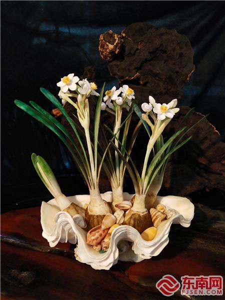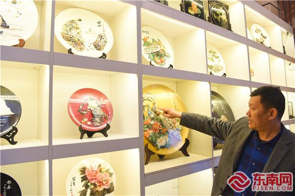 在平潭貝雕藝術館,詹勝向記者介紹貝雕作品。東南網記者 張哲昊 攝 走進平潭貝雕藝術館展覽廳,里面擺滿了各式各樣的貝雕作品,從形象逼真的花卉到端莊秀麗的仙女,讓人應接不暇,其中有不少出自詹勝之手。 這些年,平潭國際旅游島建設風生水起,來嵐游客數量逐年攀升,這也為平潭本土工藝品帶來了商機。著眼于打造文化旅游新名片,當地政府努力推動傳承、保護貝雕藝術,打造貝雕伴手禮,令市場再度掀起了“貝雕熱”,相關產業再度崛起。 得益于此,福建映像海壇文化創意有限公司成立3年后,在2015年首次營業額突破百萬元。