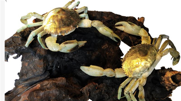 詹勝創作的貝雕《活蟹》。 受訪者供圖 詹勝的作品《活蟹》就是以平潭特產——金鱘為靈感創作的,這也是他對藝術執著追求的生動詮釋。他說:“傳統的貝雕作品一般是靜態的,我希望能有所創新,制作出能夠‘動起來’的作品?!?/p> 為了用貝殼制作出逼真的金鱘,詹勝特意買來了兩只金鱘,細致入微地觀察它們的一舉一動,還用游標卡尺精確衡量金鱘每個部位的尺寸,并將自己的構思一一畫在設計圖中?!盀榱四茏龀霰普娴摹瘅\’,我選擇黑蝶貝作為基底,用噴槍來焊接貝殼,讓紋路更加清晰?!闭矂僬f。 經過反復地精雕細磨、堆貼組裝,詹勝成功讓“金鱘”的前肢兼具彈性和力度,每一只蟹腳都可曲折,令人嘆為觀止。 “這是一門‘指尖上的藝術’,從設計、分解,到黏合、拼合,其制作工序多達數十道,一件作品常常要花上幾個月的時間手工打磨?!闭f起貝雕的制作步驟,他如數家珍。 秉持著對藝術的執著,詹勝苦練“內功”,在貝雕圈子里有了一席之地,并獲得了市場和收藏界的認可。如今,他的作品最高可以賣出上萬元的價格。 活態傳承,復興貝雕產業