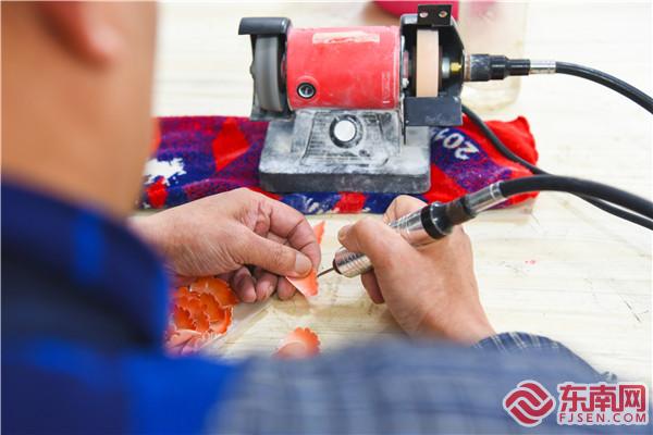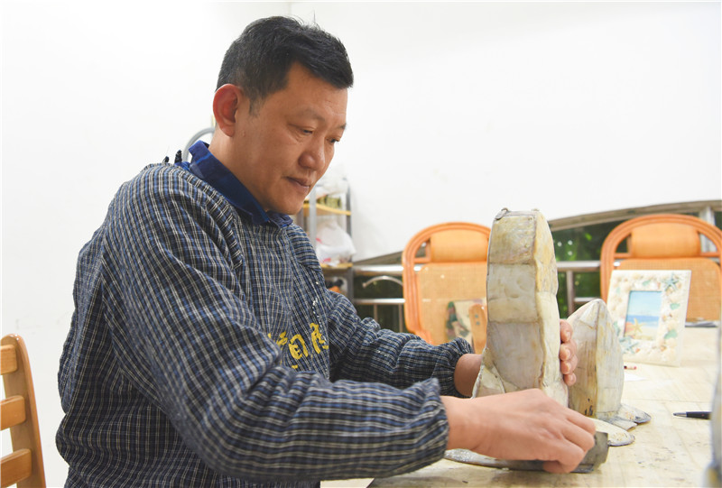 詹勝正在雕刻紅口螺。東南網記者 張哲昊攝 貝雕是最具平潭特色的民間工藝,至今已走過六十余載的歷史。 早在1955年,平潭就創辦了全國首家國營貝雕工藝廠,上世紀80年代進入鼎盛時期。據介紹,貝雕工藝廠那時有數百名員工,加上“家屬工”有上千人之多,其生產的貝雕造型別致、頗具韻味,深受消費者青睞,還曾出口美國、日本等多個國家和地區。 詹勝是土生土長的“平潭郎”,出生于1969年,家人大多從事文化藝術行業。他的表哥、表姐當時都在貝雕廠工作,常常把貝雕帶回家里加工賺“外快”。正是在這樣濃厚的氛圍之下,詹勝與貝雕結下了不解之緣,對這門手藝有著特殊的感情與回憶。 1987年,走出校門的詹勝選擇師從知名畫家,同時也是自己姐夫的許學明,進一步學習美術。隨后,他當起了個體戶,先后涉及家具、裝修、廣告等行業,從事裝飾畫、木雕、玻璃畫雕刻等藝術創作。 時間來到上世紀90年代初,由于時代變化、國企改制、市場消弭等因素,平潭貝雕工藝廠倒閉,存留的貝雕藝術品大多散落在民間,名噪一時的平潭貝雕產業逐漸沉寂?!柏惖袼囆g是平潭文化的根與魂,是數代人的美好回憶,其價值不可估量,若是‘弄丟’了,被后人遺忘,這將是一大損失!”詹勝痛心疾首地說。 彼時,詹勝與哥哥詹立新交流起了“搶救貝雕”的想法,二人一拍即合,共同走上了非遺傳承之路。 說干就干。他們開始四處收集流失民間的貝雕作品,近20年來前后搜羅了數千件貝雕,并置于工作室中,儼然是一個貝雕博物館。他們還開設了貝雕專營店,販賣精致的貝殼工藝品。 盡管貝雕專營店生意平平,卻在當時引起了不少人的關注?!邦櫩蛡兌嗍瞧教侗镜厝?,他們來參觀、選貨的時候會告訴我,貝雕終于又重現江湖了,這讓我感到很欣慰?!闭矂僬f。 中年學藝,終圓“貝雕夢”