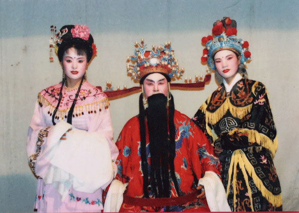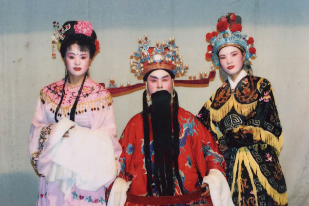 虞東生和徒弟合影。受訪者供圖 “之所以叫做三角戲,是因為原先只有生、旦、丑三個角色?!庇輺|生一邊搬出他的“寶貝”,一邊和記者解釋道:“它是由花鼓戲、黃梅戲、采茶戲、邵武民歌融匯演變而成,講的是老百姓的日常生活,主角們都是農民、小商販、土財主之類,很受老百姓喜歡?!背錾?944年的虞東生,自小就與戲結緣,介紹起三角戲來,更是如數家珍。 虞老說,他從小就是個“戲迷”,常常在戲臺旁邊看邊模仿?!?0歲時,我整天泡在村里的戲團學戲?!庇輺|生回憶,“雖然年齡小,但是我記性好,學唱腔、動作、樂器都比大人快。跟黃師傅學習1年后,我就能在排戲缺人的時候頂戲,有時候還教大人表演?!?/p> 1960年的一個晚上,虞東生到城里觀看越劇后,詢問越團負責人是否收人,得到的回答是“只要女的,不要男的”,難過和失落涌上心頭。當時,他便抱定決心一定要進劇團。 “沒過多久,我又找到三角劇團團長黃敏杰。他說進劇團要考,我學過戲當然不怕考試!”下半年,虞東生便抱著父親買的二胡進了邵武縣三角劇團。 進劇團后,虞東生追隨羅雪官、付子卿、周老三等師父學習三角戲,以扮演老生為主,也客串些其他角色。由于對樂器的偏愛,他利用業余時間向樂師學二胡、笛子、鑼、鈸、嗩吶等;每到一個地方演出,他還會向當地老人或前輩請教戲藝和曲譜,并把所學的樂譜都記下來。 獨奏一場戲 練“絕活”一心多用