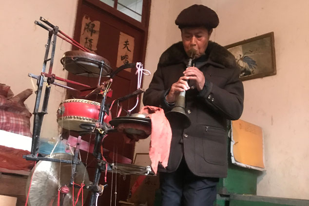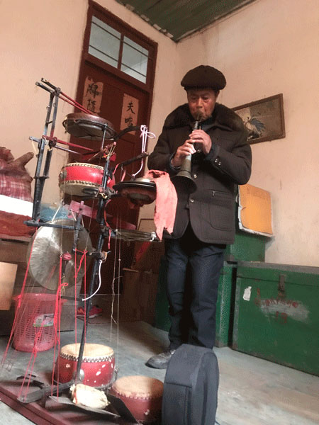 虞東生演示“絕活”。劉建飛攝 “我試著把大鑼、小鑼、大鼓、小鼓、叫鑼、鈸和板等樂器焊接到一套道具上,自已做‘獨門樂器’。像這樣,一邊用腳踩擊大鑼、小鑼、大鼓、小鼓、叫鑼、鈸和板,一邊用嘴吹笛子或嗩吶?!庇輺|生一邊說,一邊擺弄著他的“獨門樂器”。 “工具做出來后,練就 ‘絕活’還得靠自己。剛開始練的時候非常難,不是忘了手就是忘了腳,總是配合不好。但是我堅持每天都練,練到腳打抖,抬腳都難?!本瓦@樣足足練了四個月,虞東生的“絕活”終于練成了。他一人能攬下6個人的活,同時演奏8 種樂器,成了“一心多用”的器樂手。中央、省、市多家媒體都曾對他這一絕活進行報道。 虞東生還有另一個 “絕活”——飾演《天官賜?!防锏奶旃?。每當鄉村開新臺,這個節目是必上的。節目里只有天官一人主唱,其他十三個演員圍著天官轉。能扮演天官的都是德高望重的老藝人,除現年90歲的老前輩劉明外,村里只有虞東生能演天官?!斑@么多年,只有我會在開新臺時表演?!闭f到此事,虞老頗為自豪。 潛心譯舊譜 教徒弟傳承文化