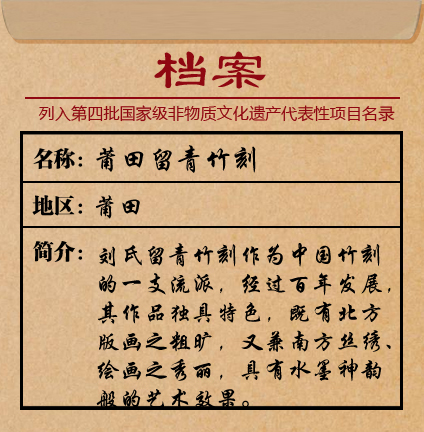 留青竹刻始創于唐宋,明清時期漸成為一門獨立的藝術種類。清代乾隆中期,劉氏入閩第36代裔孫劉材成創辦竹木雕作坊。如今,莆田留青竹刻第七代傳承人劉志高秉持古學遺風,先后在莆田建立了竹刻研究所,成立莆田雕塑學會。