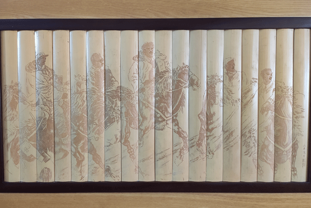 劉志高的作品《延安歲月》。受訪者供圖 “留青是利用薄似紙張的竹皮,包括竹青、竹筠、竹底的不同層次顏色表面,應用刀法‘做文章’,表現筆墨、意韻和刀味。創造出立體與平面透視相結合的竹青層雕刻藝術形象,鏟去空白處的竹青,露出肌層作為畫面底色。由于雕刻時保留具體物象的竹青,故名留青?!眲⒅靖哒f,陷地留青則以青皮做底色主調,所刻物像陷入不同纖維層間,深度和厚度可無限制放大,使色調形成鮮明的對比。 經過百年發展,劉氏竹刻藝術形成獨特風格,即“材盡其美、工盡其巧、器盡其雅、格盡其高”。劉志高弟子劉建新坦言,劉氏留青竹刻以往大多刻在筆筒、臂擱、鎮紙、折扇等文房雅玩上,受到文人青睞。創新后的陷地留青竹刻,在大型作品上突破了空間限制,增強了厚重感,可與木工藝相配置,鏤刻屏風、插屏、掛幅之類作品。使其既有北方版畫之粗曠,又兼南方絲繡、繪畫之秀麗,具有水墨神韻般的藝術效果。 “竹皮為黃色,竹肌為紅色,歷年越久,竹皮、竹肌的色差越大,層次越豐富,視覺趣味越濃。猶如初熟之櫻桃、拋光之琥珀,頗受市民、收藏家青睞?!眲⒅靖吒嬖V記者。 匠心獨運 手藝人接力傳承