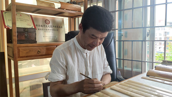 劉志高的留青竹刻作品。東南網記者楊超斌 攝 藝術需要傳承和創新,才有特色和價值。上世紀80年代末,國內工藝品市場尚未形成規模,許多“手藝人”靠手藝僅能維持生活。留青竹刻更屬于冷門藝術,那時花一兩個月刻的一片作品還不值百元。因喜歡留青竹刻,劉志高將其作為修身養性的習慣。 “小時候,在前輩們的熏陶下,我對留青竹刻情有獨鐘,常跟在他們背后觀察學習。念初中時,我邊學功課邊學雕刻。希望世代相傳的劉氏竹刻工藝不要到我們這一代荒廢?!眲⒅靖呋貞浾f。 留青竹刻工藝技法要求創作者具備繪畫、書法等功底?!跋扔谢A,才能入刻?!眲⒅靖邚男¢喿x家中古籍,同時學畫。1992年初中畢業,自幼酷愛繪畫的劉志高進入廈門鼓浪嶼學國畫,并到中國書畫函授大學研修山水畫。他接過祖傳的“接力棒”,潛心鉆研留青竹刻藝術。此后,整整7年時間,他甘于寂寞和清貧,常常獨守雕刻室,一坐就是好幾個小時,用繡花針般的刀具勤練刀法。