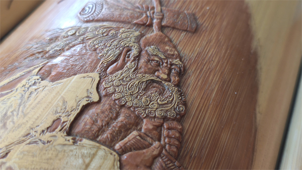 留青竹刻制作工具。東南網記者楊超斌 攝 在工作室里,劉志高向筆者展示了形如楔子的刀刃。他說,每次創作都是漫長的過程,有時一天只能刻三、四個字??坍嫳瓤套指鼜碗s,用的刀具更多。有圓頭的、扁頭弧形似鏟子的,大大小小超過20把。一幅30厘米×10厘米的作品,得刻一兩個月。 刻刀掠過,竹花翻卷。劉志高“刀起刀落”,技法嫻熟,將尋常的竹子化為栩栩如生的藝術作品?!傲羟嘀窨讨谱黜樞驗槊璁?、割線、刮面、鏟底、采皮、挑腹、打磨等。只有沉下心來,才能在竹刻技法上不斷突破,雕出精品?!?/p>