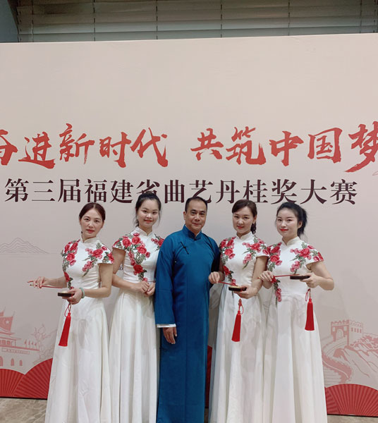 鄒超燕(左起第四位)與呂萬春為學生們表演。受訪者供圖 連續唱了幾段后,鄒超燕心想“呀,這我會??!”同事們聽他唱得有模有樣,大膽提出,由他作為代表參加演出的想法。本就對唱曲子有著濃厚興趣的鄒超燕欣然應允了,正式開始學習唱曲子。為了盡快掌握技巧,他先后拜師唱曲子省級非遺代表性傳承人陳德泉和呂萬春,希望從他們那里學到最正統的唱腔。 “館長讓我趕緊學起來參加曲藝節,當時真是時間緊,任務重?!编u超燕咬著牙逼自己快點學會。為了練好唱調唱腔,他常把自己關在衛生間,沒日沒夜地練習?!按笙奶鞄謵炗譄?,經常練得大汗淋漓?!编u超燕說。 但擺在他面前最大的困難,并不是學藝的勞累,而是周圍人異樣的眼光。 “唱曲子是瞎子的事,你做這個干嘛?”“唱的東西聽不懂,一點意思也沒有,你也學?”……自鄒超燕決定學習唱曲子以來,這樣的反對聲、嘲諷聲不絕于耳。但他并未因此言棄:“唱曲子是祖宗傳下來的東西,有重要的歷史和語言價值。我不僅要學會,還要盡我所能,把建甌的曲藝項目傳承下去!” 終于,經過一段時間的學習和堅持,鄒超燕習得了其中精髓,成為了唱曲子的一把好手,并用親身行動回應了質疑:2012年,由他領銜表演的建甌唱曲子《全城之母》首次登臺便轟動芝城,在省第四屆曲藝節上獲得節目三等獎。他表演的《楊明勸妻》,則獲得省首屆“丹桂獎”曲藝(電視)大賽業余組表演獎三等獎。 2017年,鄒超燕被評為南平市第五批非物質文化遺產保護項目建甌唱曲子代表性傳承人。 舊瓶裝進新酒