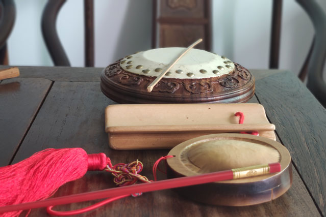 建甌唱曲子表演時用到的樂器扁鼓、竹板、竹鼓。東南網記者 陳艷攝 正聊著,鄒超燕輕聲唱起了《楊明勸妻》。忽然,他覺得缺點什么,轉身從辦公桌抽屜里取出一只實木扁鼓和一副竹板?!斑@就是唱曲子的伴奏樂器,結構簡單、方便攜帶?!闭f著,他即興表演起來。 那曲中,有建甌風土人情,有芝城歷史故事。扁鼓與竹板默契相和,配上說唱的曲調,形成了富有閩北特色、獨一無二的建甌唱曲子。 無意之中成全
